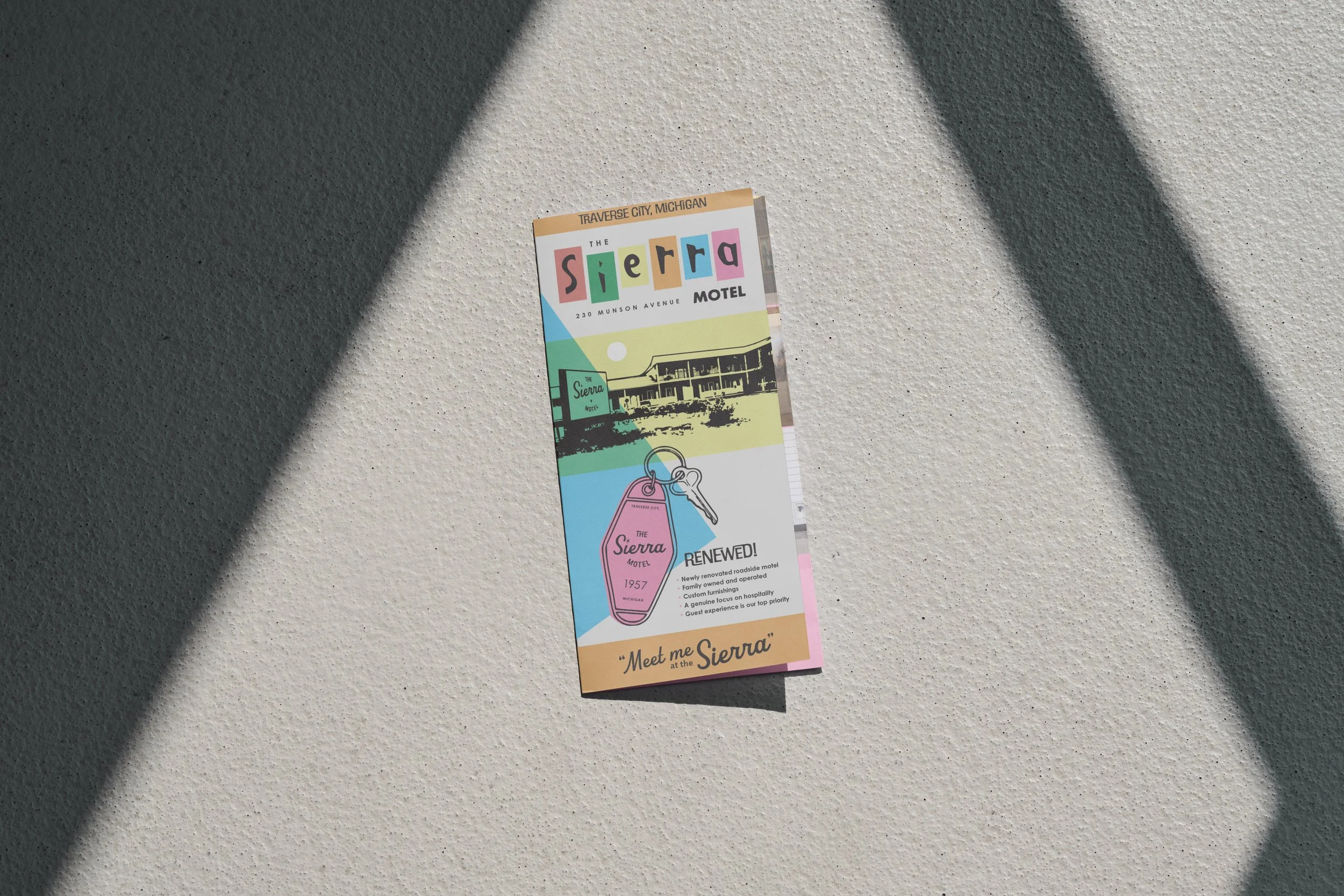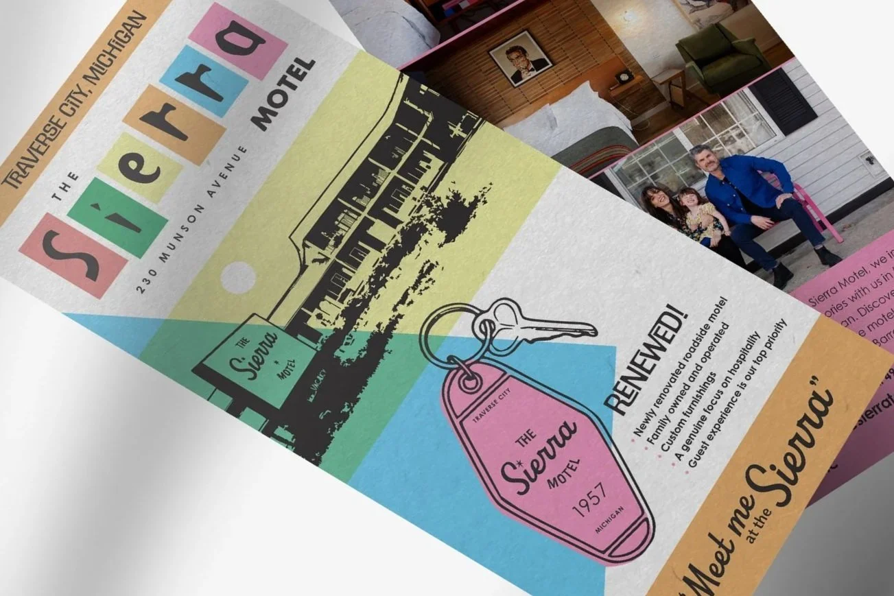 The Sierra Motel is a charming vintage retreat nestled in the heart of Traverse City, Michigan. Recently revitalized by owners Barrett and Andrea Corrigan, this classic motel seamlessly blends retro allure with modern comforts. Guests can enjoy beautifully renovated rooms that pay homage to the motel’s storied past while offering all the essentials for a memorable stay. With the collaboration of Peers and Friends, The Sierra Motel now sports a fun new logo and printed collateral that captures its unique spirit.